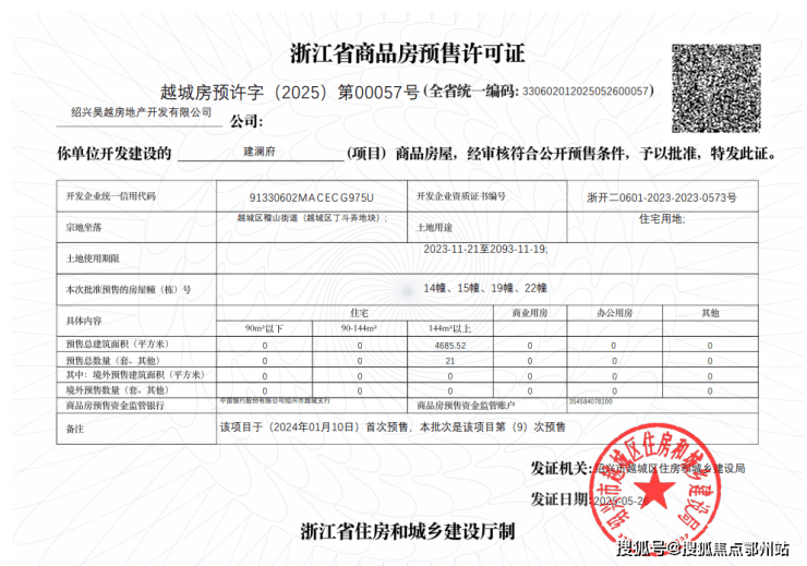 越城区人民政府网站公布了 建澜府14#、15#、19#、22# 的预售许可公告。