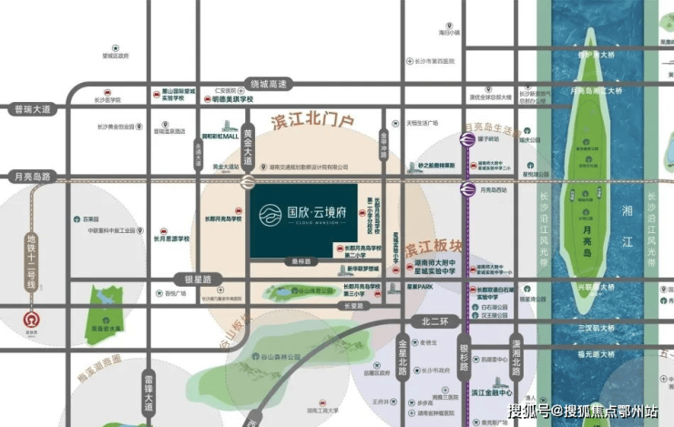 城市TOD交通路网——临近黄金大道、月亮岛路、银星路等城市干道;距离地铁4号线月亮岛西站约2.1公里(百度直线测距),未来将与地铁12号线(规划中)无缝对接;项目周边的黄金路月亮岛路口公交站,有多条公交线路途经。