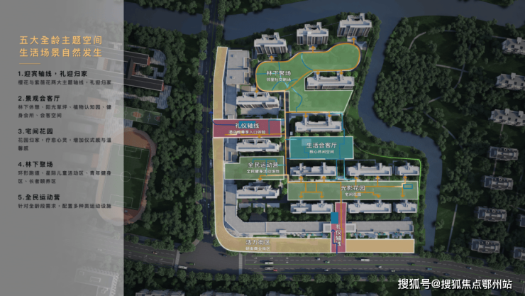 社区空间方面,还打造了 两轴一厅一场一营一园林的五大全龄主题空间,将自然景观和城市生活完美的融于一园。