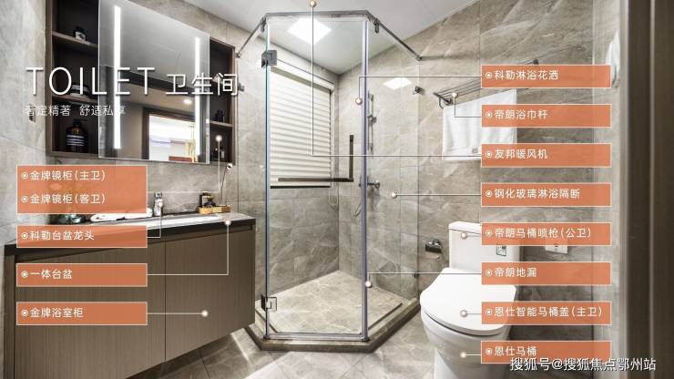 ♦卫浴空间主卫智能马桶盖 / 紧急报警按钮 / 预留防溅插座 / 柔和暖风机 / 主卫防雾化妆镜/镜柜内置插座