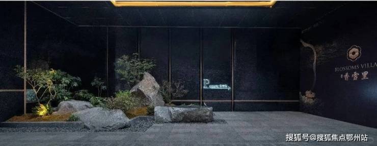 而对景墙则以亚马逊绿奢石打造,中央巧妙镶嵌金石,刻画出项目Logo,并镌刻“香雪里”之名,以及超山特有的六瓣梅花图腾,形成一道视觉上令人赞叹的风景线。