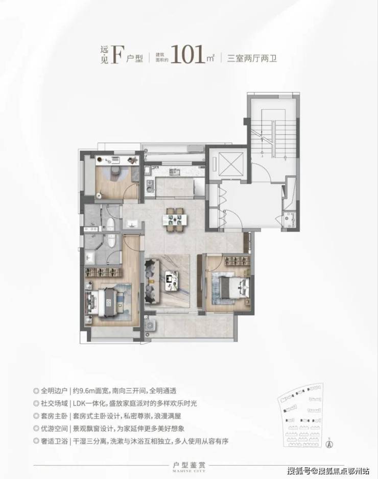 高层101㎡经典飞机户型,南北通透、三开间朝南,客餐厨一体化布局,主卧套房设计,无连廊干扰,得房率高达75%;