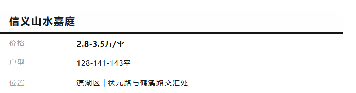 信义山水嘉庭仍在售带装修低密度多层房源,均价28000-35000元/m²,建筑面积约128、141、143m²。