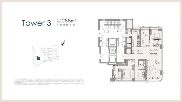 项目分为前后南北双地块,各有2栋150米超高层和风貌别墅,超高层44层、层高3.3米,大户型层高约3.5-3.6米。