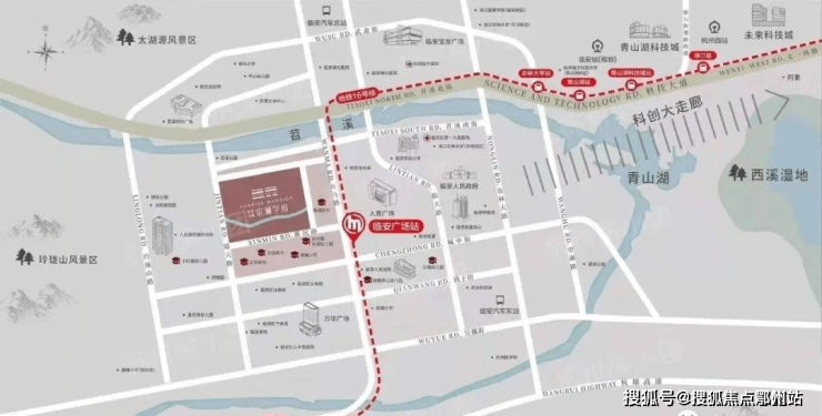 直线距离约800m地铁16号线临安广场站,4站青山湖科技城,10站直抵未来科技城绿汀路华润TOD综合体,