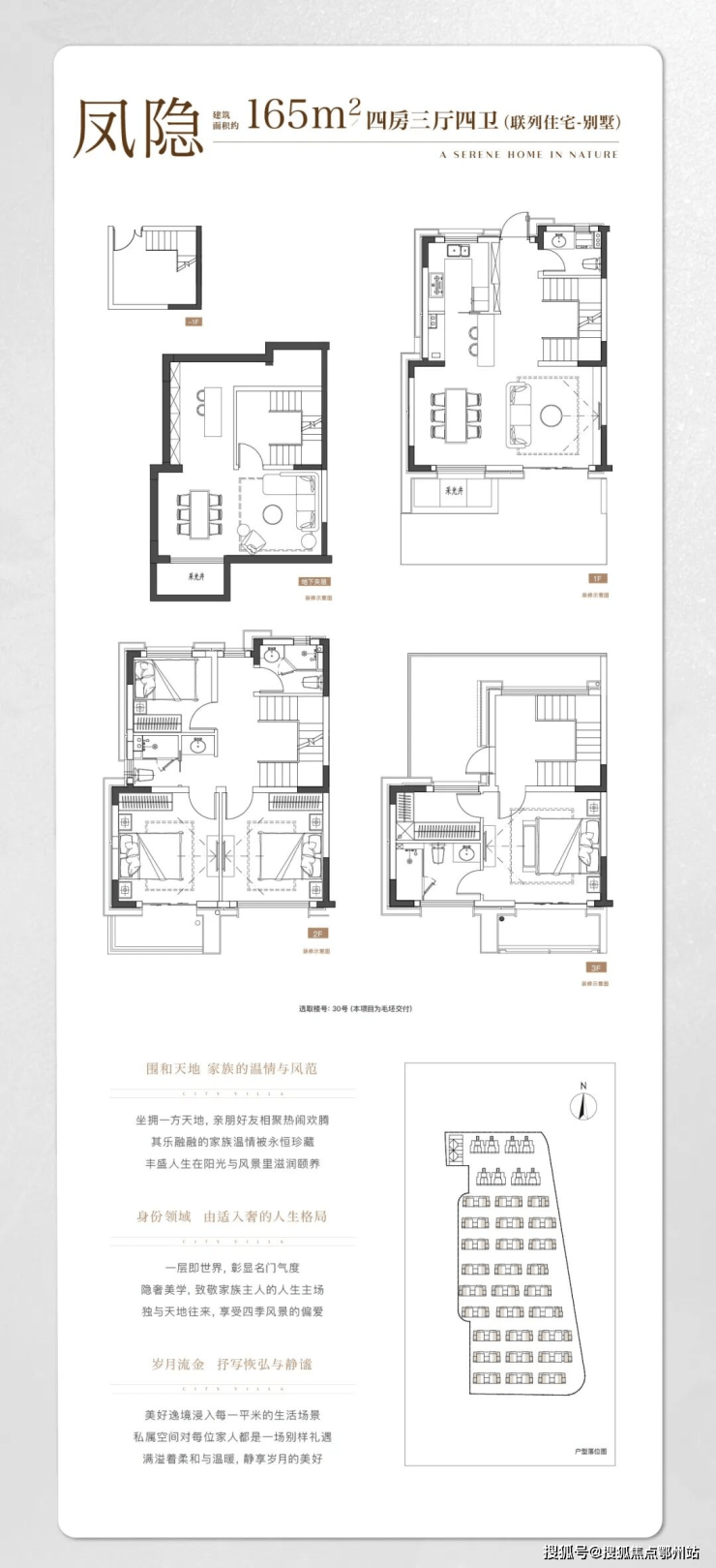 大华·梧桐院由27栋联排和4栋叠拼组成,总规划可售户数141户,容积率仅约0.75。