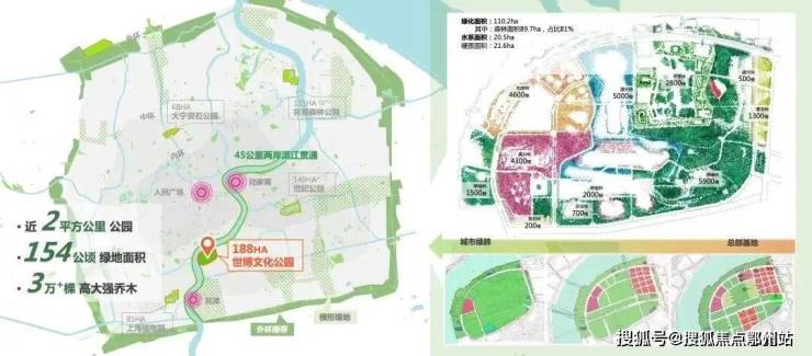 约200万方世博文化公园+前滩百万方公园群+三林绿地,共构成约700万方滨江公园,成就滨江双S湾最大的百万方公园群。