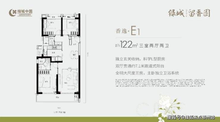 建面约122平户型:边户,同样是南北通透的三房,两开间朝南且三面采光,利用率很高,没有浪费空间,南向阳台开间超7米。