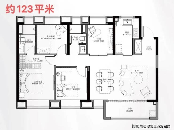 123㎡四房两厅两卫,厅更6.3米面宽,可以扩展成多功能空间。