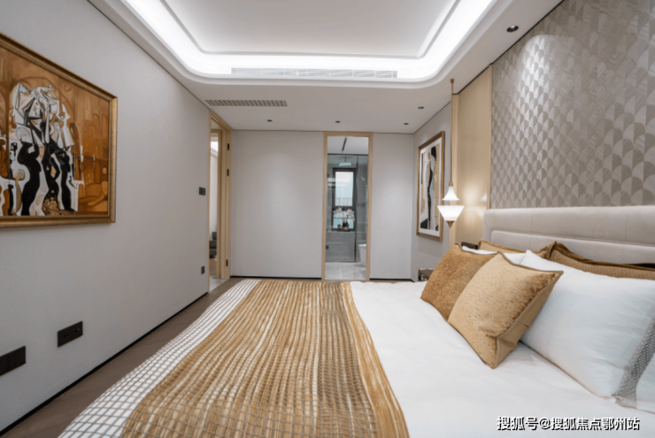 另外,像卧室地板,没有采用常规横拼、竖拼,而是采用 复杂的斜拼,只为更美观;吊顶设计同样暗藏匠心,采用多层次曲边造型,为空间增添优雅的线条感。