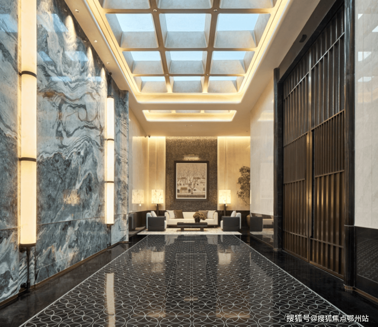 如果说清水样板房将激发未来别墅生活的无限想象力,那么实景示范区则将归家期待化为“沉浸式奢居体验”。从踏入别墅专属入户空间的那一刻起,尊崇感便渗透每一个细节:立面选用珍稀白玫瑰奢石,纹理灵动且自带温润光泽;地面铺设慕尼黑大理石,沉稳中尽显仪式感;顶部透光云石装置交织暖光,仿佛穿越光影秘境。