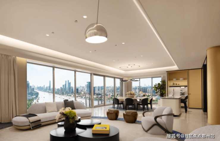 最大化消融室内外的界限, 将江景与阳光框景入室 ,尊崇感十足!客厅尺度设阔,无论是家庭生活还是高端社交,空间都能随之完成功能的转换。