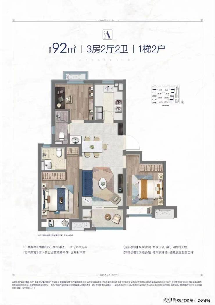 建面约92㎡、116㎡3房2厅2卫户型,这两个户型布局非常相似,都做了三开间朝南+全卧室带飘窗+南北通透+主卧套房设计+卫生间干湿分离,都是3房户型中的翘楚。