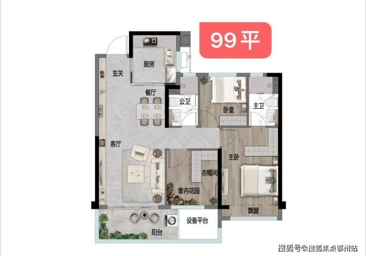 建面约99-106㎡户型 ,门槛最低,也是项目的年度爆品。