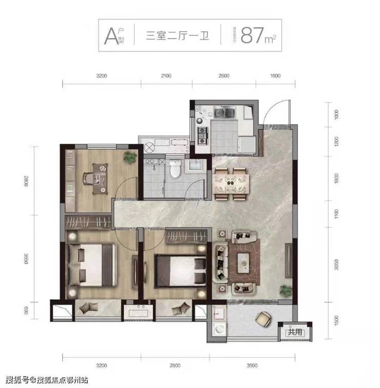 1、A户型 朗璟 建面约87㎡ 三室二厅一卫
