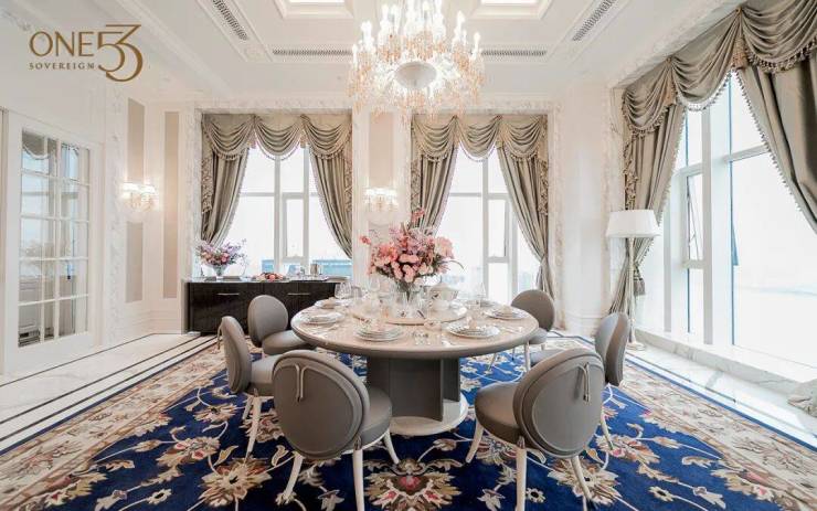 恢弘的客餐厅里,Baccarat的枝形吊灯在格子天花板高悬。爱奥尼壁柱间,边框贴满24K金箔的Interna装饰镜熠熠生辉。 它有着新古典的所有华贵元素!0