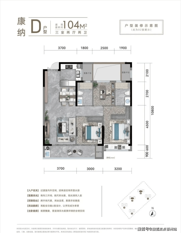 建面约98-104㎡方正三房,南向双联阳台