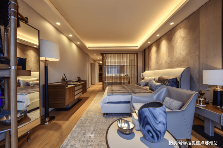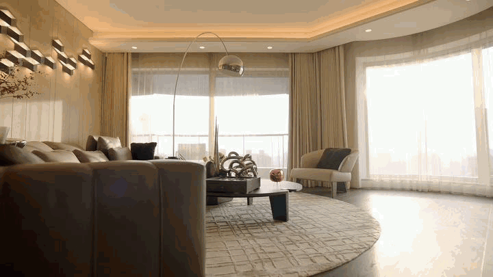 公寓的房间由著名的设计大师梁志天设计布局。空间的简约大气由每一个精心打造的细节所组成,如精致动人的饰面、纯天然的材料、优质大理石的嵌入,一切都让你在不经意间发现别样的美感。房间客厅中,素雅的灰色墙面营造出静谧优雅的氛围,空间视觉的塑造与都市韵律相得益彰。Giorgetti定制家具、B&B全屋豪华家具、FLOS经典灯具的选择,彰显着设计师对美学平衡的精准把握。