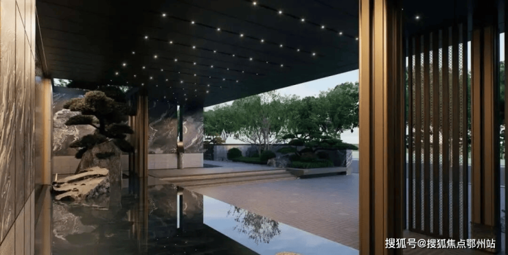 而门口的墙面,更是用大理石与绿植山石装裱出一幅立体的山水画,在垂直立面上演绎“石中有画,画中有境”的宋式空间美学。为了契合宋代织锦的“天华纹”, 泳池对景墙独创了“琉璃錾铜·经纬叠映”的构造 ,以铜为骨,内嵌玻璃砖墙,用琉璃构建出特殊的“经纬提花”