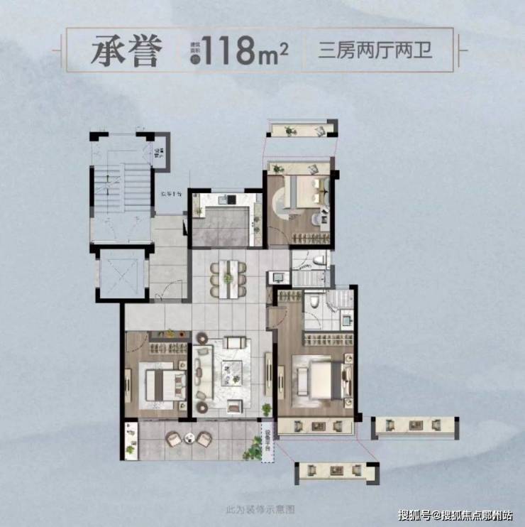 以建面约118㎡三室两厅两卫为例,户型周正, 三开间朝南,南北通透,