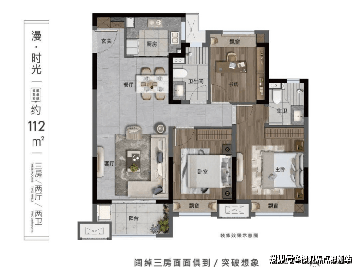 三开间朝南 、户型十分方正, 三个房间都有飘窗 ,拓展了室内的空间; 餐客一体、大开间 的设计,小户型做出了豪宅感,两个卫生间设计,是市面上难得一见的 功能性小三房 。这款小户型总价低至79万,刚需可入手!