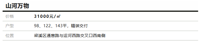 目前,山河万物7#、17#楼已启动落位,在售建面约98、122、143平的小高层房源, 均价31000元/平