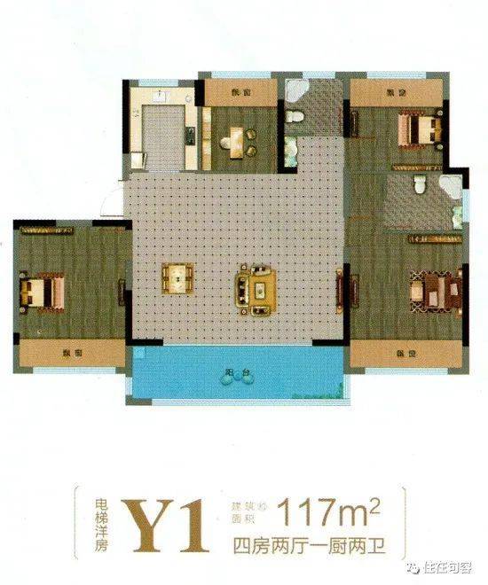 洋房得房率高,117㎡四房两厅两卫;