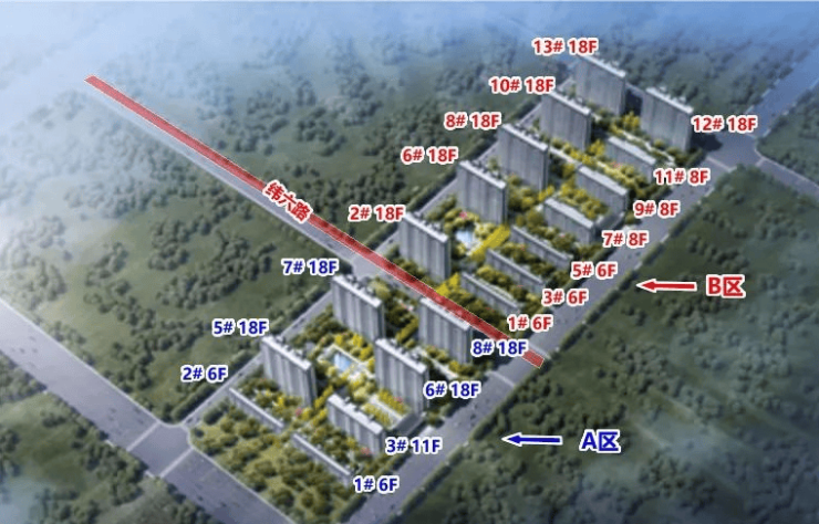 A区的1#2#为6F叠墅,3#为11F小高层,5#6#7#8#是18F高层。B区的1#3#5#是6F叠墅,7#9#11#是8F洋房,2#6#8#10#12#13#是18F高层。