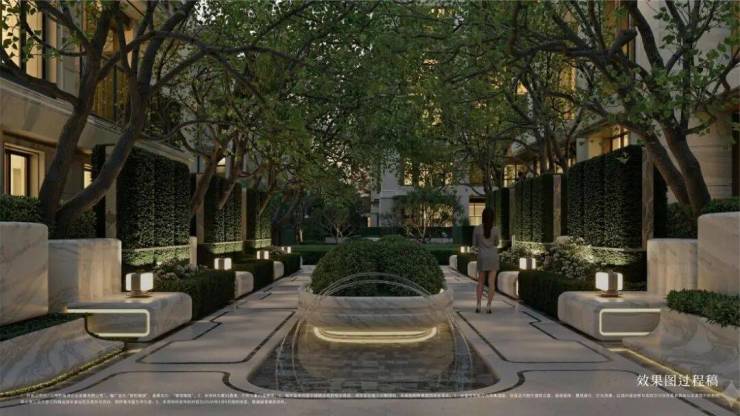 保利·珺园的社区景观以"两环二轴"为核心布局,带来上海罕见双下沉式庭院,并以东方庄园的世界表达为内核。