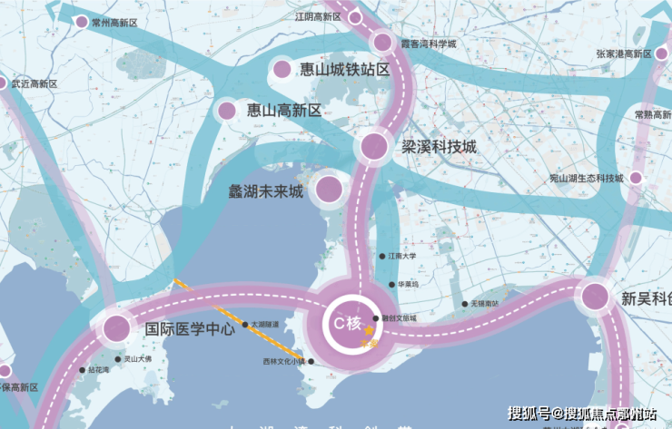 太湖新城,无锡双核之一,形成了商务商贸中心、科教创意中心和休闲宜居中心,是无锡高端商务、金融机构、企业总部、专业服务的集聚区,代表城市未来的发展方向。