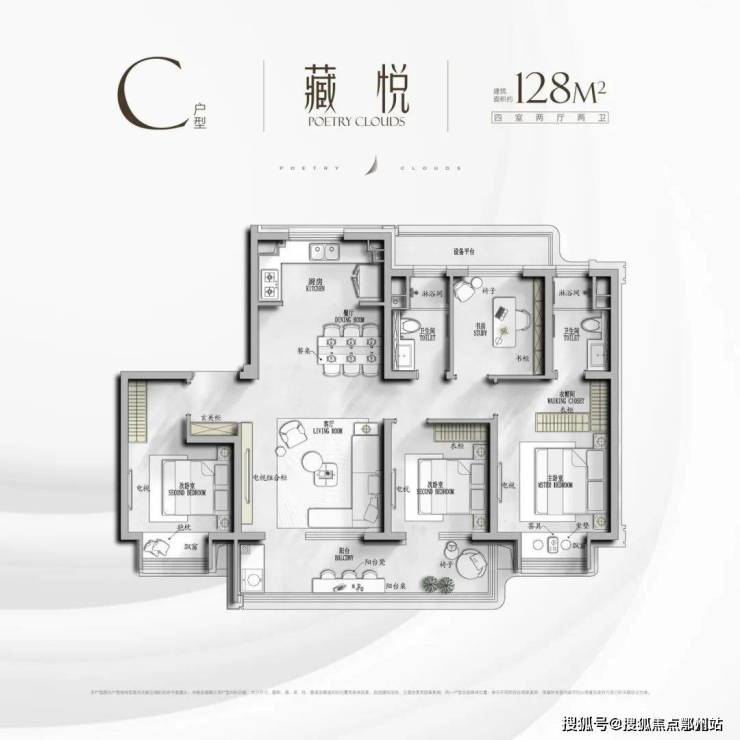 目前已经公开的样板间是建面约 128㎡四房户型,四开间朝南,视野开阔,全明设计。