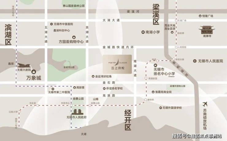 先看大区位,项目位于 梁溪区、滨湖区、经开区三区交汇处,从无锡主城区地图来看, 正居黄金十字中心位,完全可以用六个字形容:老天爷赏饭吃。