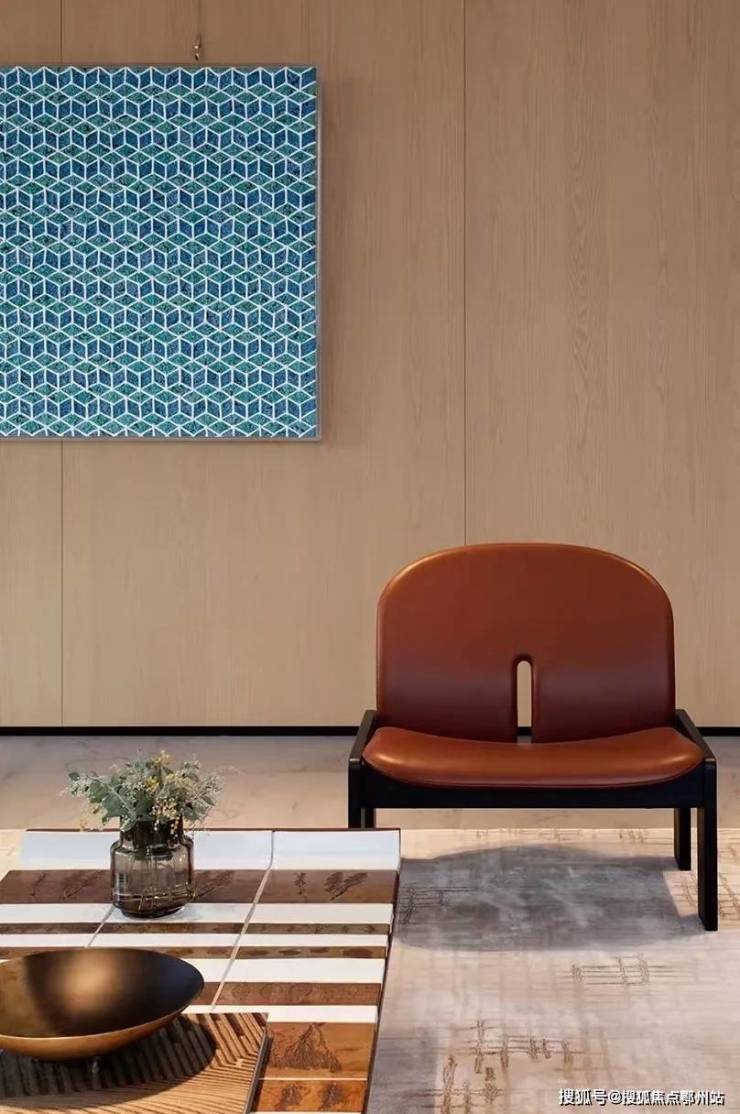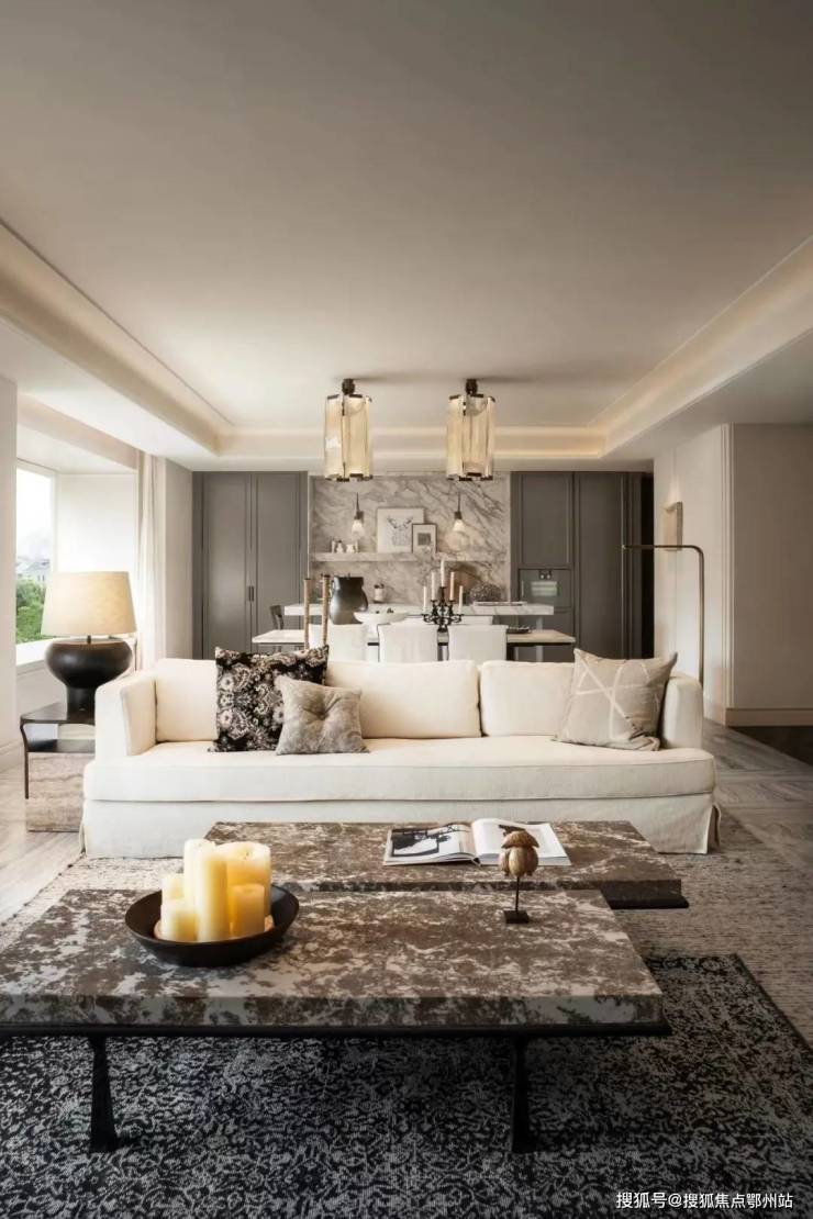 客厅视野开阔,地面选用银河白奢石,并配以“云杉”东方禅意幽香,由稀有天然中式香料提取,带来悠远宁静的五感意境,由闻献为亭舍定制调配“当生活变得过分随性时,很容易丢失了对仪式感的关注。”