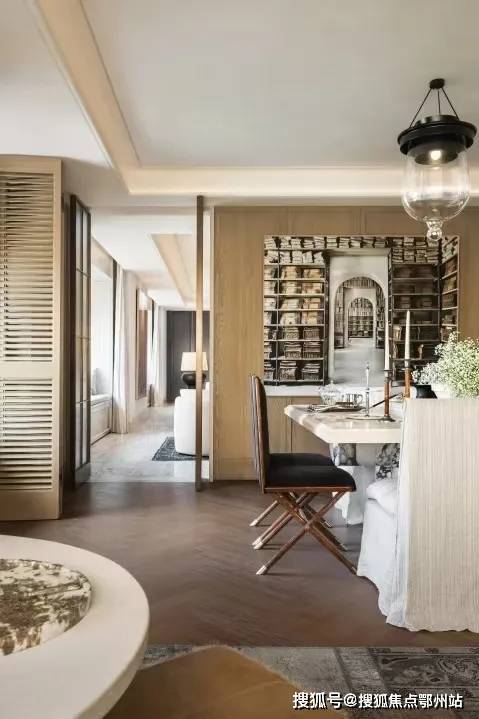 餐桌吊灯为琚宾团队设计的原创灯具;圆桌内置有内嵌式电动转盘,将生活的当代性隐入日常的使用中。