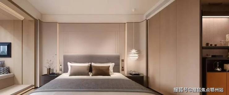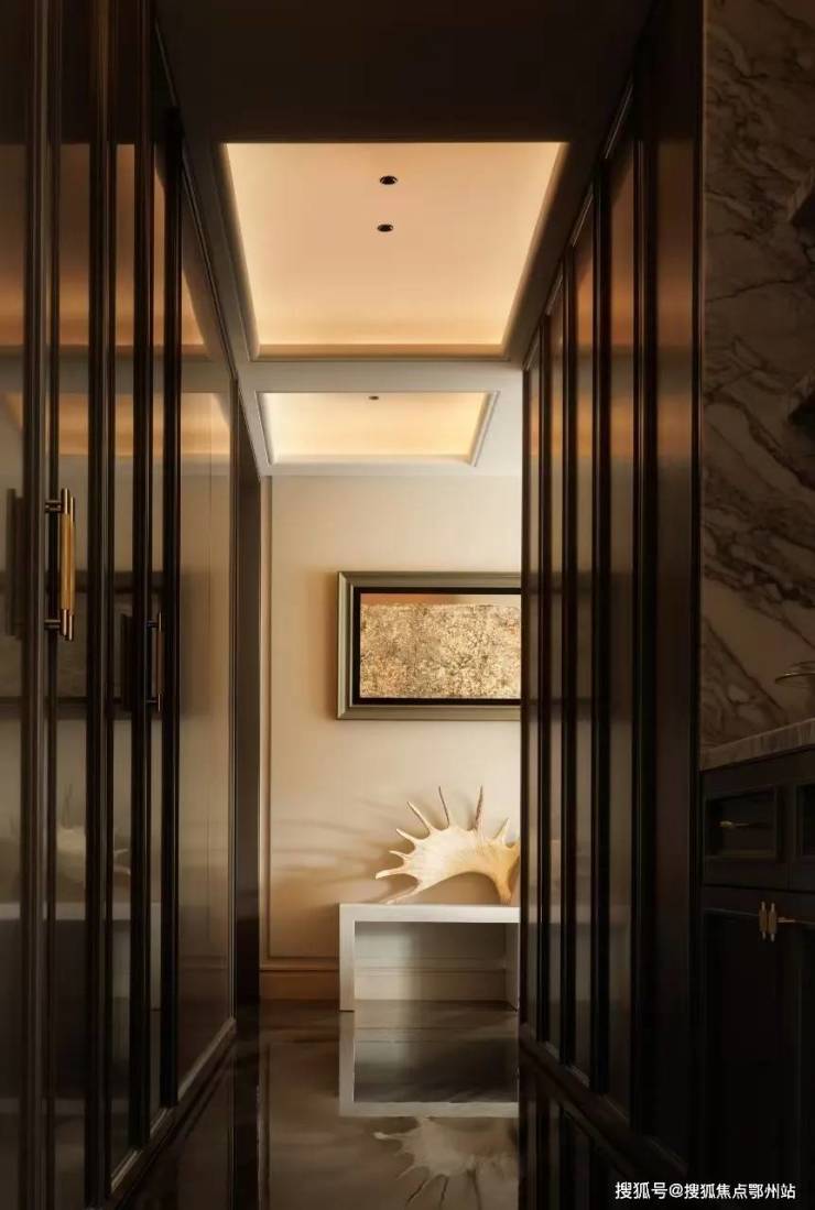 主卧、卫生间、衣帽间、书房通过廊道的关联被依次串联起来,让套房在功能上构成了简洁且有效的动线组合。主卧区域的采光极佳,窗外一片青翠,飘窗的场景化设计变成了这个空间的重点所在。在飘窗的内向包裹之下,150mm 高度的地台增强了飘窗的区域界定。主卧及书房立面的局部点缀了镜面材质,对空间起到了一定的延展作用。在特定区域的镜面反射之中,突出了艺术品在空间里的存在感,强化了空间与器物之间的紧密联系。
