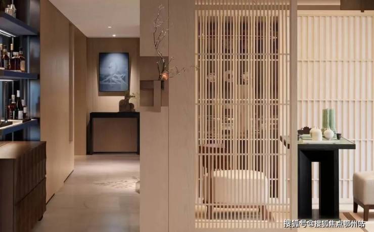 入户瞬间,心绪就静了下来,被宁和包裹。明亮的自然光透过远处超长百叶飘窗,充盈着室内。眼前,一座轻盈茶室如漂浮小岛,打破以往的格局经验,巧妙嵌入锁定视觉。半通透的屏风巧妙打散光线,若隐若现的朦胧之中,温润氛围弥散而开。