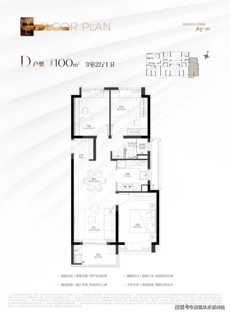建筑面积约100㎡3房D户型:南北通透的设计让该户型拥有更加优秀的通风效果。而且这个户型做到了全卧飘窗(3个飘窗)+南向瞰景大阳台,丰富的灵动空间提升了实得面积!