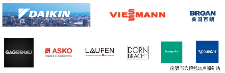 大金空调,菲斯曼地暖,百朗新风,嘉格纳烟机灶具,ASKO厨房五件套(洗碗机,蒸箱,烤箱,冰箱等),劳芬马桶,当代龙头花洒。