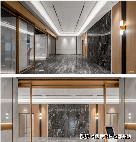 挑高入户大堂也非常吸睛,大面积岩板,两侧动线镶嵌金属线条。