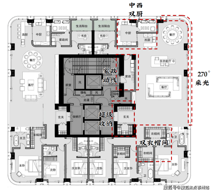 针对高净值客户,私密性显然是最重要的。电梯双开门设计,家政服务人员也有单独出入动线,尽可能减少对业主的影响。
