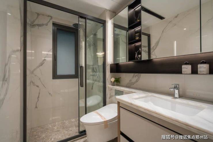 主卫配了酒店式壁挂智能马桶,市面上很少见。卫浴间配置了线条式暖风机、汉斯格雅花洒+顶喷、自带加热除雾功能的通长镜柜、天然大理石台面细节上精益求精,诸如 玄关柜的收纳系统、木饰面的应用、仿大理石瓷砖