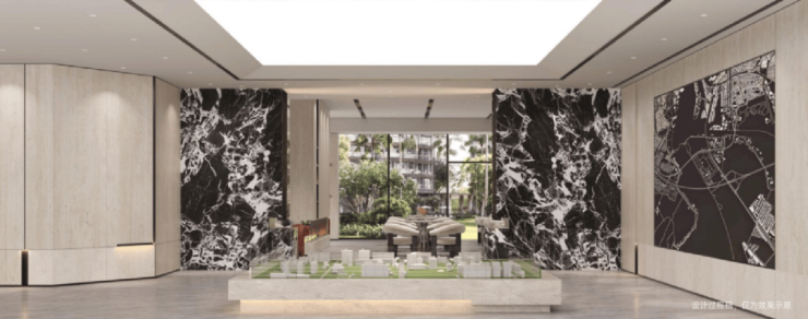 售楼处设计源自伦敦与上海半岛酒店的优雅复古, 将现代极简主义美学运用到极致。沙盘区景墙将取材Celine御用石材宝格丽黑大理石,以永不过时的摩登气息,点睛空间的奢华精致。