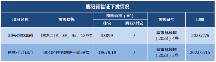 襄阳新增 2张住宅预售许可证,分别为东津新区 东原·千江印月项目和襄州区 阳光·四季襄郡项目,共批得住宅预售面积58578.19㎡,新增房源 约533套
