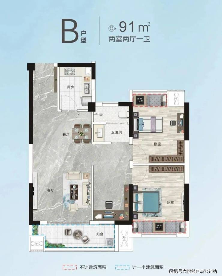 阳光·四季襄郡目前推出的为建面 约91㎡两室两厅一卫,整体户型方正,拥有较大的横厅面积。