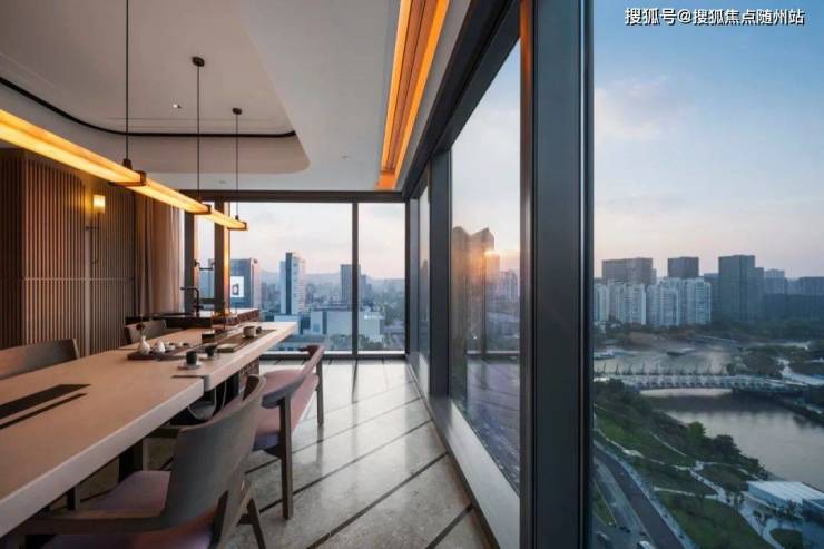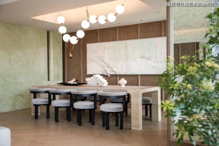 新加坡SCDA的约510m²设计作品,拥有画廊一般的序厅,透光屏风背后是客厅,地面通铺着杏灰色的奢石「镜湖春晓」,仿佛运河或西湖流动的水。一半是餐桌,一半是京杭大运河——在武林广场,才有这样的奢侈。
