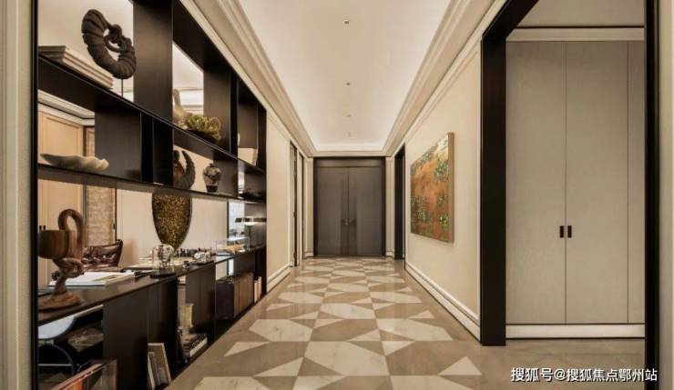 御钱湾建面约410-460㎡平层户型通过创新空间规划展现顶级居住品质。项目采用经典新古典主义设计语言,入口空间以几何拼花石材地面与白色实木墙饰构建具有收藏展示功能的入户空间,形成独特的艺术化迎宾动线。