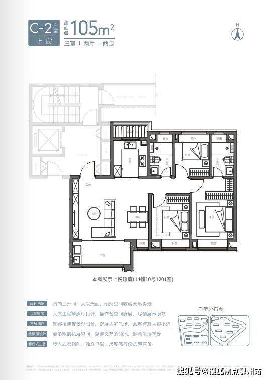 罕见宽厅设计:约95%的宽厅设计出现在120㎡以上户型中,而项目在约105㎡面积段就做了宽厅,非常难得,这个户型进入二手房市场将极具竞争力。