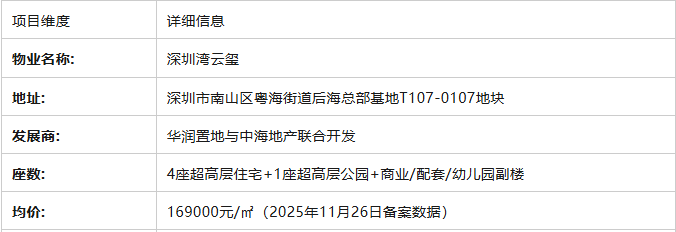 深圳湾云玺坐落于南山区后海总部基地核心地段,是后海总部基地最后一块含宅用地。项目于2024年12月由华润置地与中海地产以185.12亿元联合竞得,溢价率46.3%,刷新深圳土拍总价纪录。