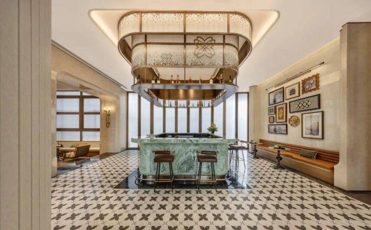 采用“王府中式”设计,大门为歇山顶形制(宽53米、高近11米),配黄铜狮、罗汉松及蓝翡翠奢石。园林融入西湖十景元素,如“花港观鱼”水景、“柳浪闻莺”绿植,并设雾森系统首层单元门厅石材铺就,肌理沉稳。