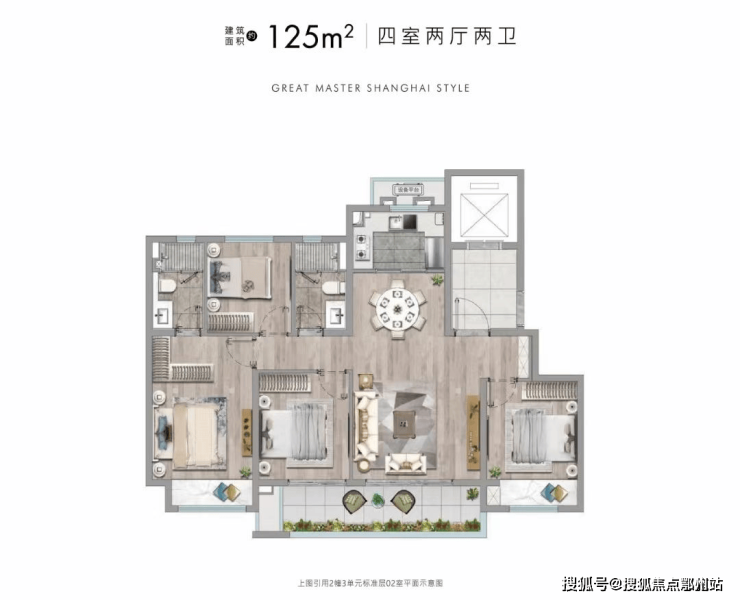 建面约125㎡精装小高层户型,则做了四房两厅两卫设计,尺度阔绰。